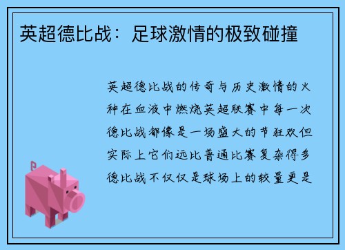 英超德比战的传奇与历史:激情的火种在血液中燃烧 英超联赛中,每一次德比战都像是一场盛大的节狂欢,但实际上,它们远比普通比赛复杂得多。德比战不仅仅是球场上的较量,更是一种城市、社区、甚至文化的对决。对于...