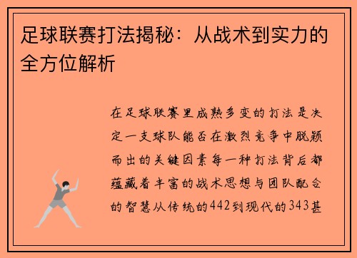 在足球联赛里,成熟多变的打法是决定一支球队能否在激烈竞争中脱颖而出的关键因素。每一种打法背后,都蕴藏着丰富的战术思想与团队配合的智慧。从传统的4-4-2到现代的3-4-3、甚至是完全压倒式的控球战术,...