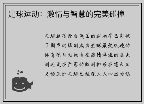 足球,不仅是一项运动,更是一种文化,一种全球人民共同的语言。从草根足球到国际舞台,无数人在绿茵场上追逐梦想,点燃激情。足球的魅力,源自于它简单而纯粹的规则:每队十一人,目标就是将球踢入对方球门。简单的...