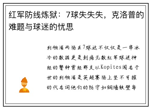 “利物浦两场丢7球”,这不仅仅是一串冰冷的数据,更是刺痛无数红军球迷神经的警钟。曾经,那支以“Kopites”闻名于世的利物浦,是英超赛场上坚不可摧的代名词。他们的防守如铜墙铁壁,每一次抢断都凝聚着不...